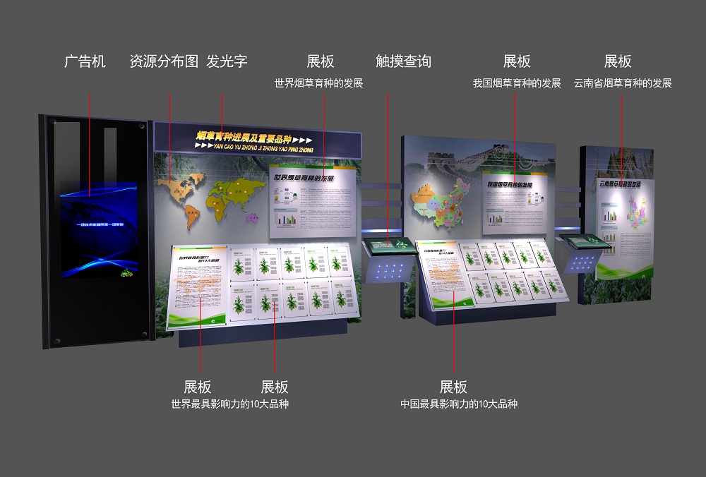 ÔÆÄÏÓñϪÊÀ½çÑÌ²ÝÆ·ÖÖÔ°Õ¹Ìü³§¹ÝÕ¼µØÃæ»ýΪ180ƽ·½Ã×£¬Éè¼Æ²ÉÓÃÏÖ´ú·ç¸ñÁ¦Í¼Í¨¹ý¹âÓ°ºÍÏȽøµç×ÓͼÎÄչʾÊÖ¶ÎÀ´ÓªÔìÒ»¸ö¾ßÓпƼ¼¸ÐµÄչʾ¿Õ¼ä¡£Õ¹Ê¾ÊÖ¶ÎÓУºÍ¼ÎÄÕ¹°å¡¢´¥Ãþ²éѯ¡¢3DȫϢӰÏñ¡¢¸ßÇåͶӰºÍʵÎïÕ¹³ÂµÈ¡£